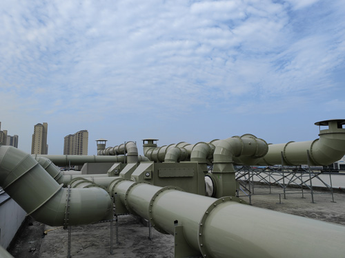進行驗室廢氣減排 → 催化活性炭包過濾水器 → 引鼓風機 → 減排